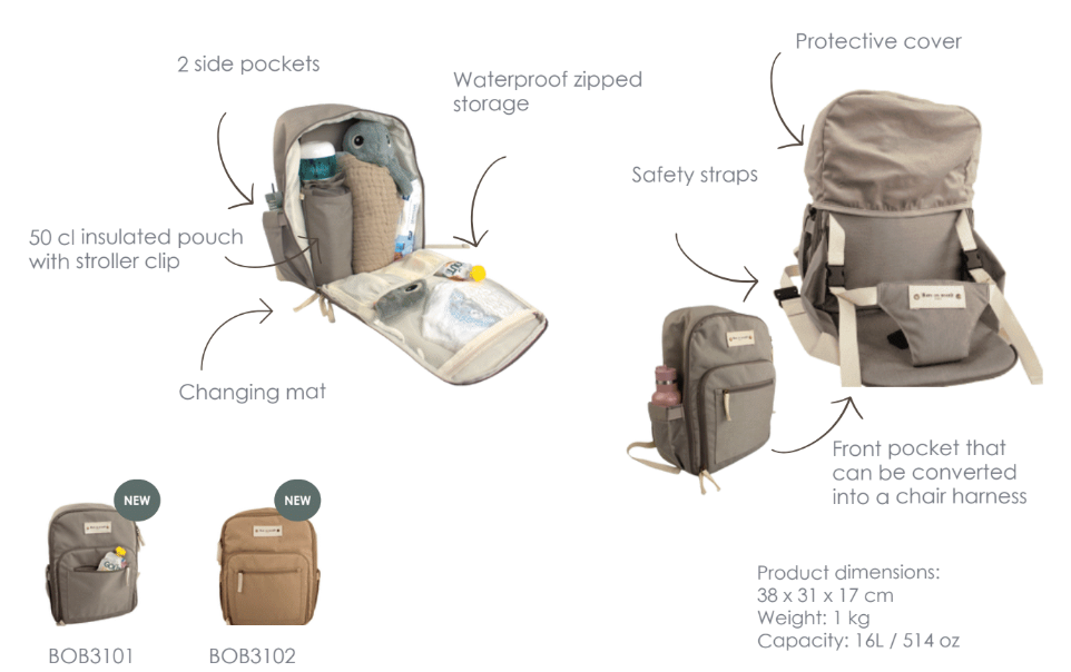 Travel with peace of mind with the Agathe bag, designed to accompany baby everywhere by offering an integrated chair harness to install him comfortably next to you.